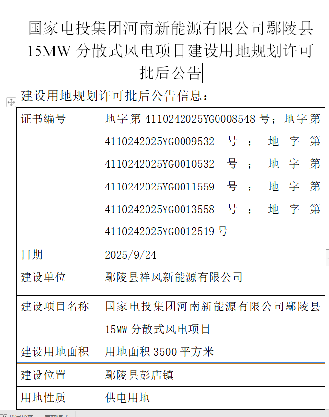 国家电投集团河南新能源有限公司鄢陵县15MW分散式风电项目建设用地规划许可批后公告