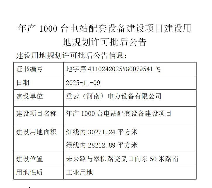 年产1000台电站配套设备建设项目建设用地规划许可批后公告