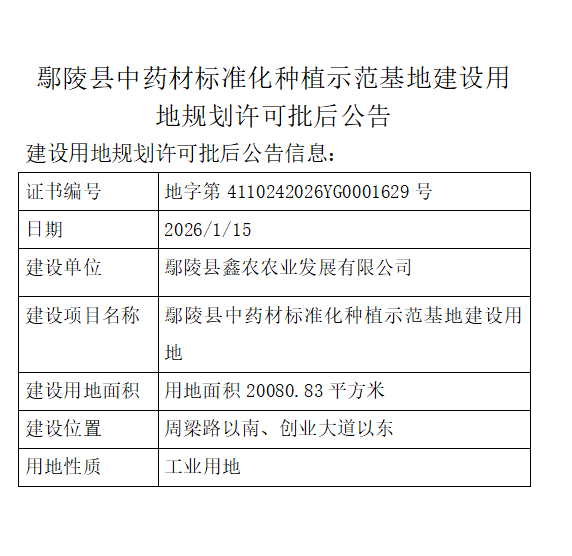 鄢陵县中药材标准化种植示范基地建设用地规划许可批后公告