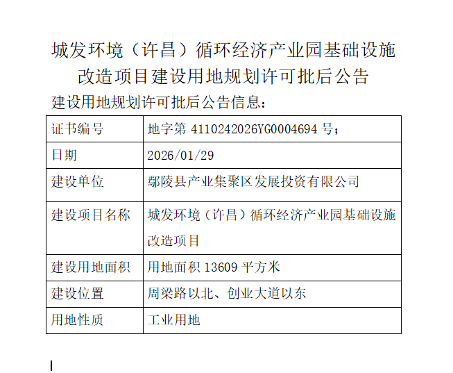 城发环境(许昌)循环经济产业园基础设施改造项目建设用地规划许可批后公告