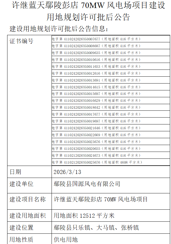 许继蓝天鄢陵彭店70MW风电场项目建设用地规划许可批后公告