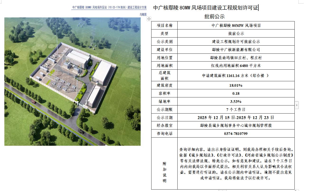 中广核鄢陵80MW风场项目建设工程规划许可证批前公示