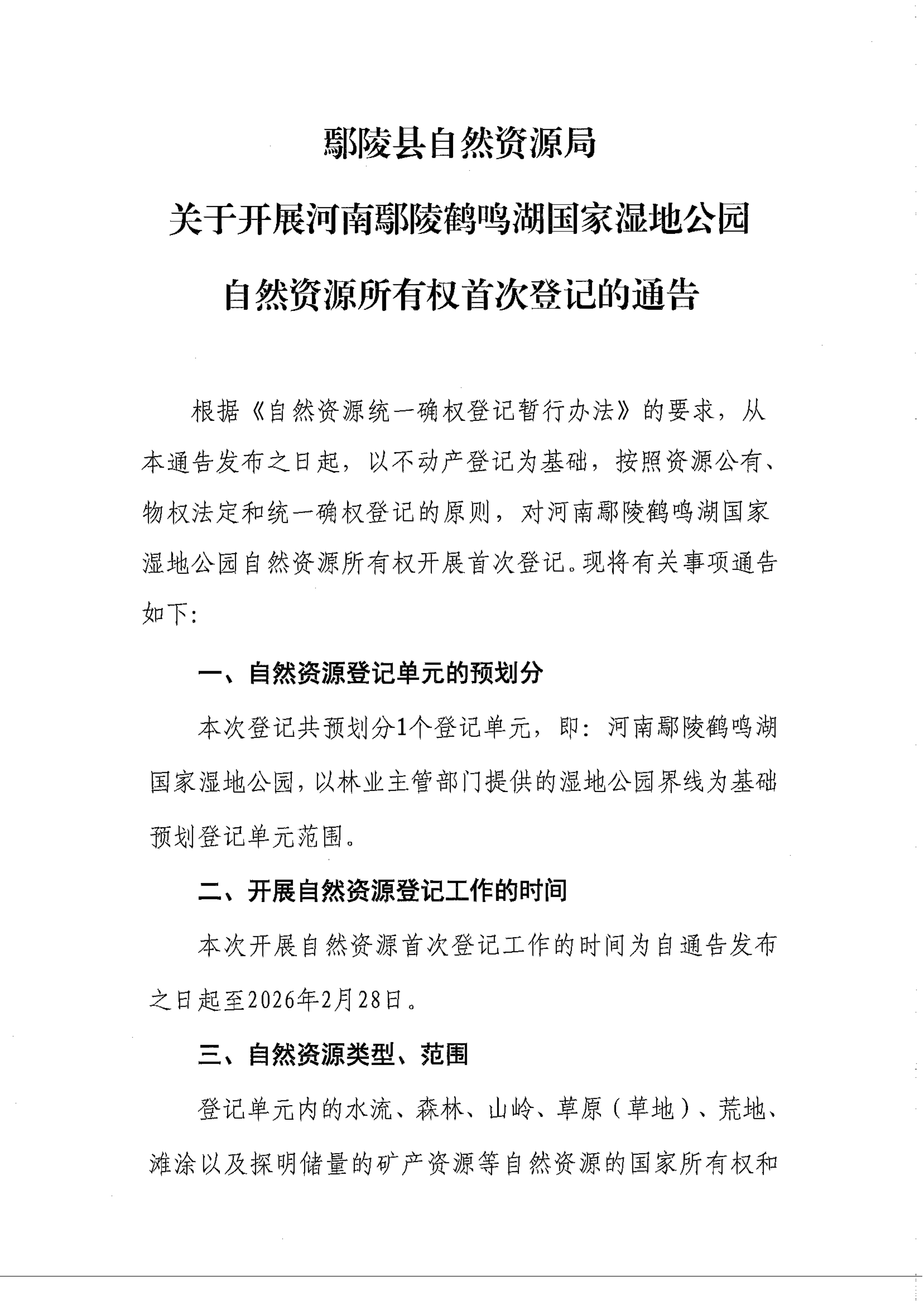 鄢陵县自然资源局关于开展河南鄢陵鹤鸣湖国家湿地公园自然资源所有权首次登记的通告