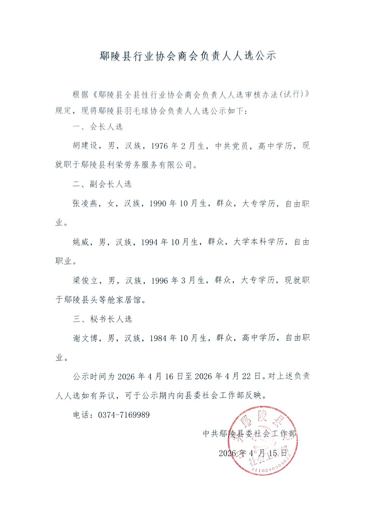鄢陵县羽毛球协会负责人人选公示