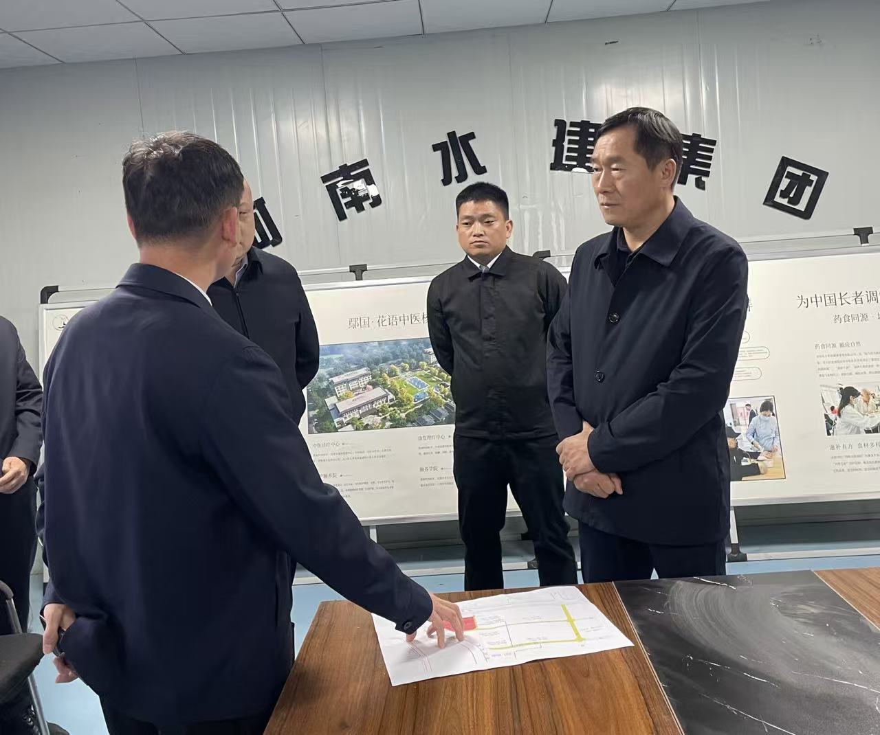 当天,田永广一行首先来到鄢国花语健康养老项目项目部,在项目建设总体规划图前驻足,与项目负责人及相关部门工作人员互相交流。“项目当前用地范围是否清晰?”“后续配套设施规划与现有用地规划是否衔接?”田永广围绕项目用地边界这一关键问题展开深入讨论,结合现场实际地形与规划图纸细节,逐一梳理用地划分中的疑问点,现场协调解决规划衔接、边界确认等问题,为项目后续建设划定清晰“施工坐标”。